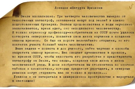Ваша задача – попасть в дом ученого, найти чертежи и способы запустить машину времени. Вас ожидает путешествие в прошлое, во времена СССР, чтобы закончить его разработки и предотвратить катастрофу на Земле, тем самым сохранив свою жизнь и жизнь человеческой расы. В доме изобретателя вы столкнетесь со многими тайнами и сложностями, которые предстоит разгадать, а неверные решения могут отправить вас не только в прошлое…